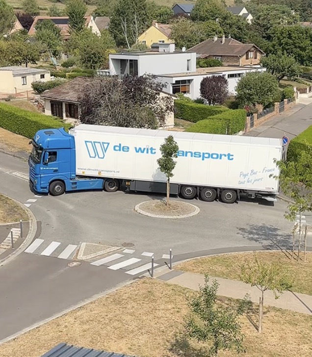 Een Nederlandse vrachtwagenchauffeur van De Wit Transport kreeg in Roemenië te maken met een onverwachte uitdaging. Op een kruispunt bleek een piepkleine rotonde te zijn geplaatst, compleet met een boompje in het midden.