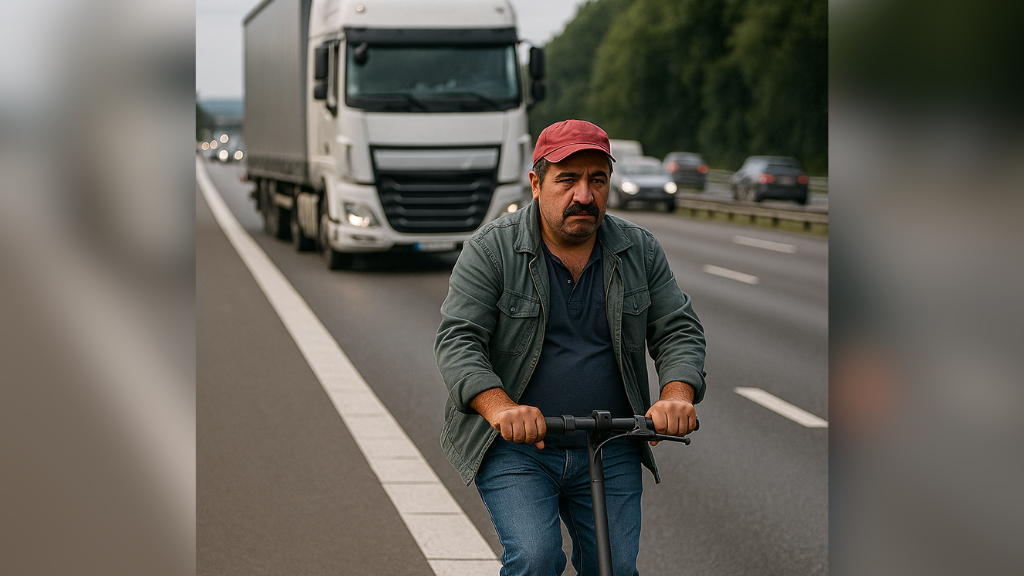 Voor sommige mensen klinkt het misschien grappig: een vrachtwagenchauffeur die na een boodschapje besluit om doodleuk met zijn step over de snelweg te gaan.